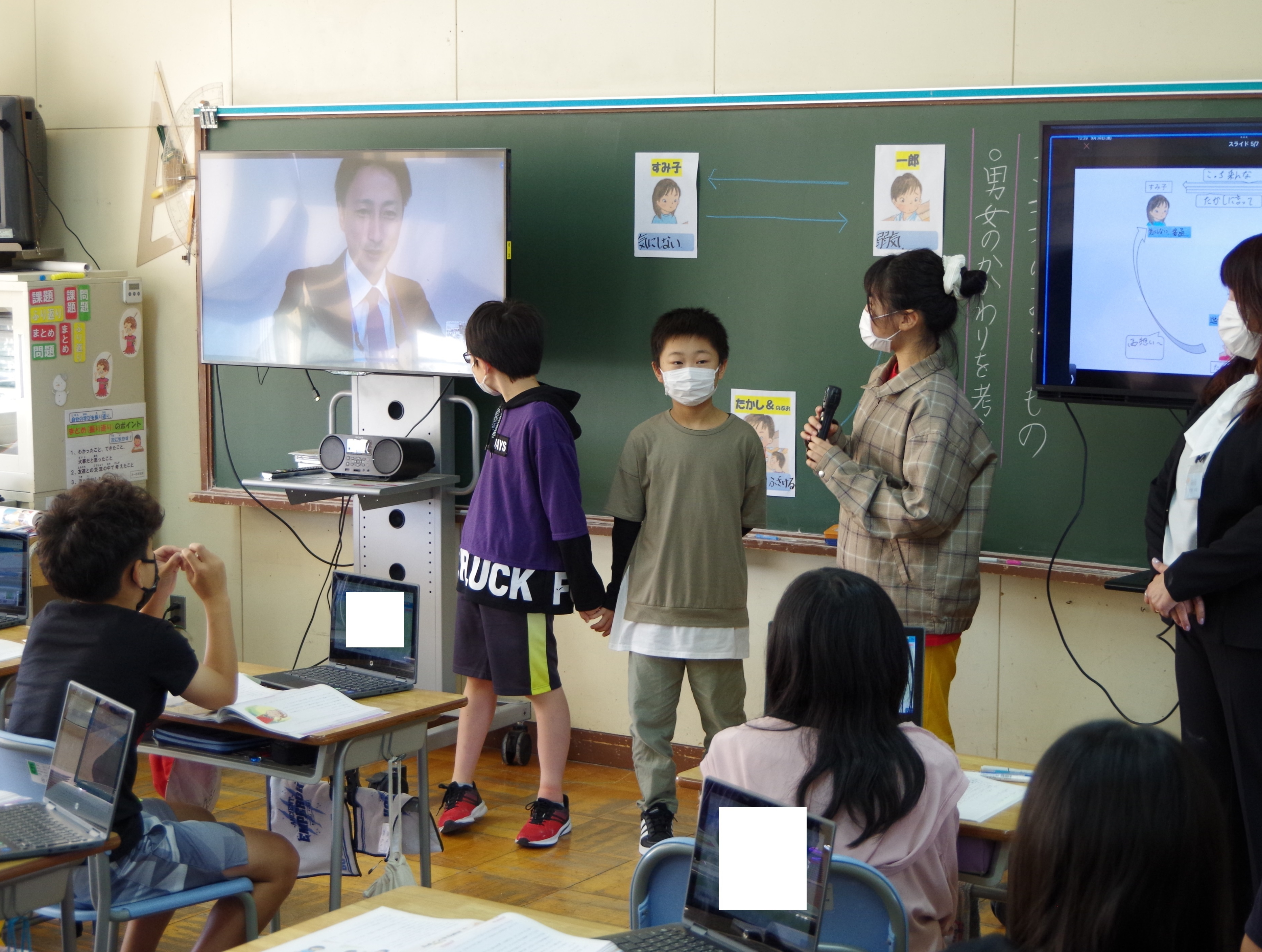 6月21日には、特別支援学級(情緒学級)の研究授業を行いました。「なかよくなりたい じぶんになろう!」の単元で、相手の気持ちを知り、自分の考えを伝えることができることを目標に授業を行いました。