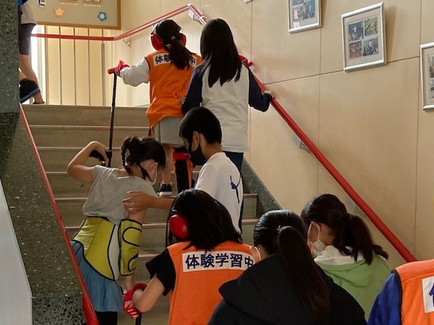 重りなどの器具をつけて高齢者の立場や気持ちを考えます
