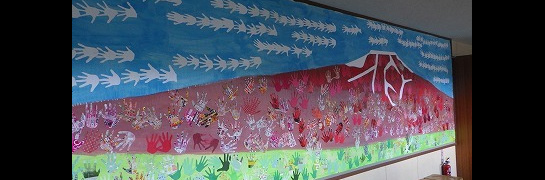 本校では特色ある教育活動の一環として「全校制作」に取り組んでいます。1年生から6年生まで全員の力を合わせてダイナミックな作品を完成させています。