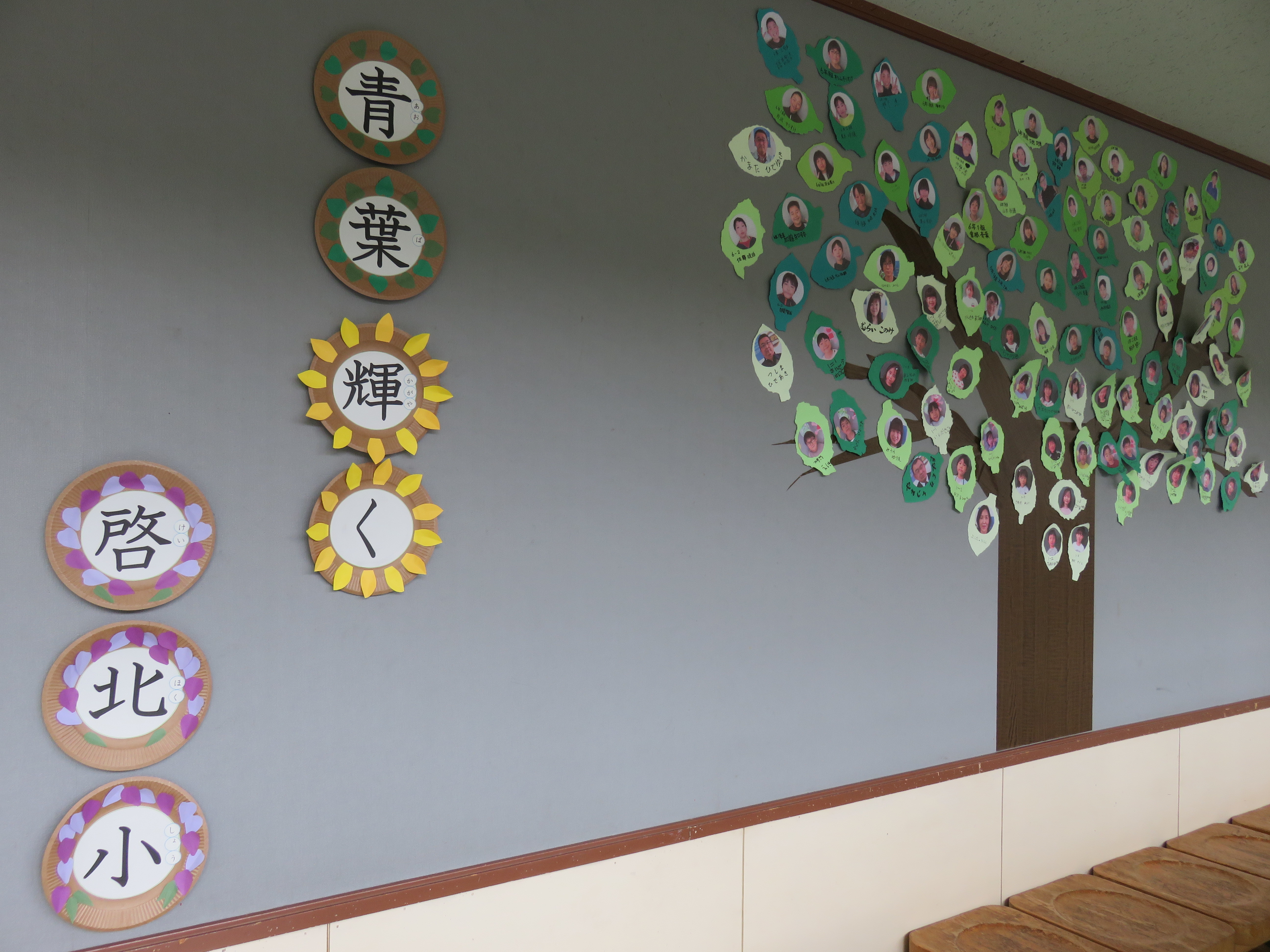 第163回目の全校制作「青葉輝く啓北小」が、児童玄関ホールの掲示板に掲示しています。全校児童336人が葉の形の色画用紙に、1人1人自分の顔をはりつけて、1つの作品にしています。