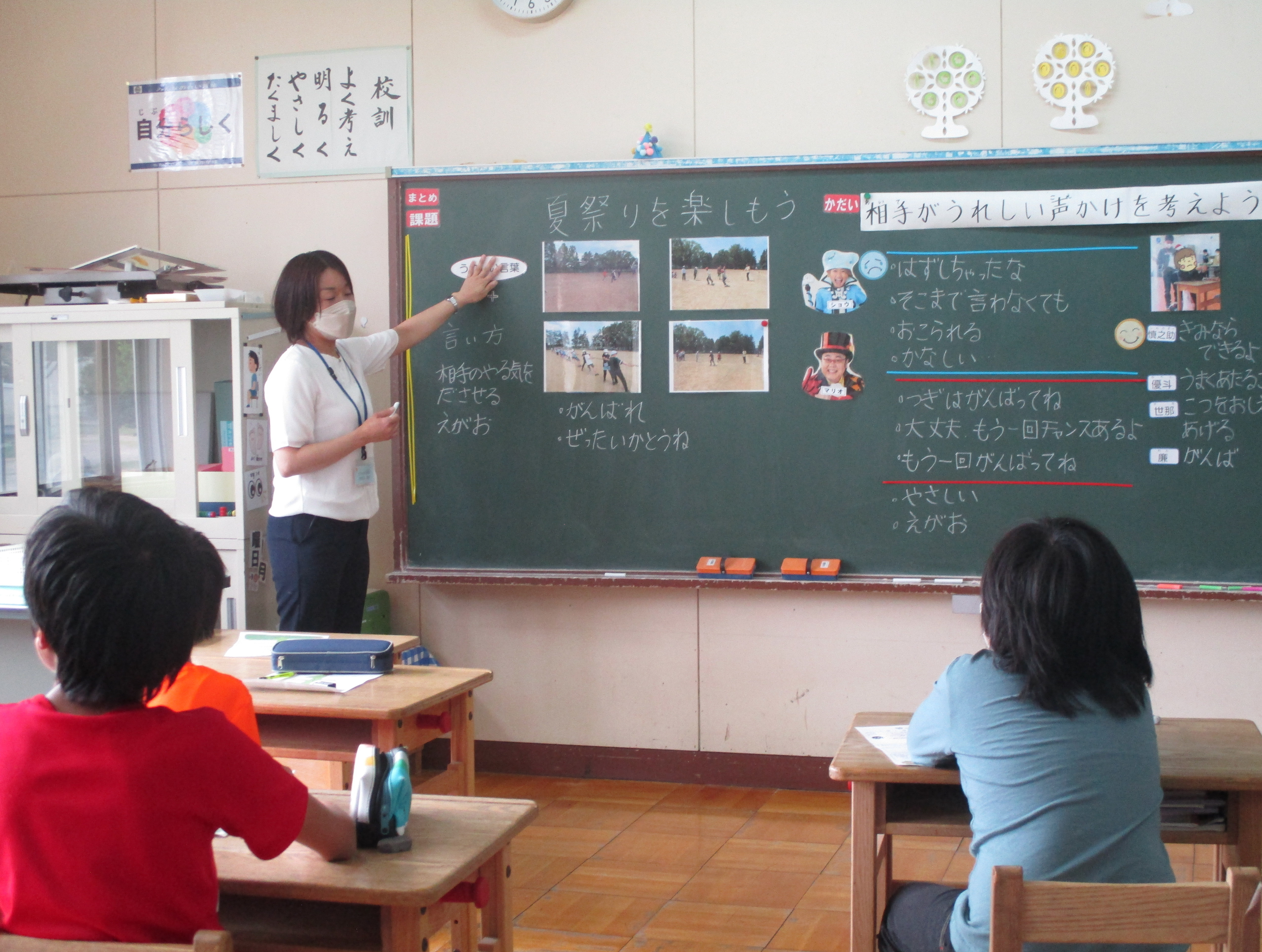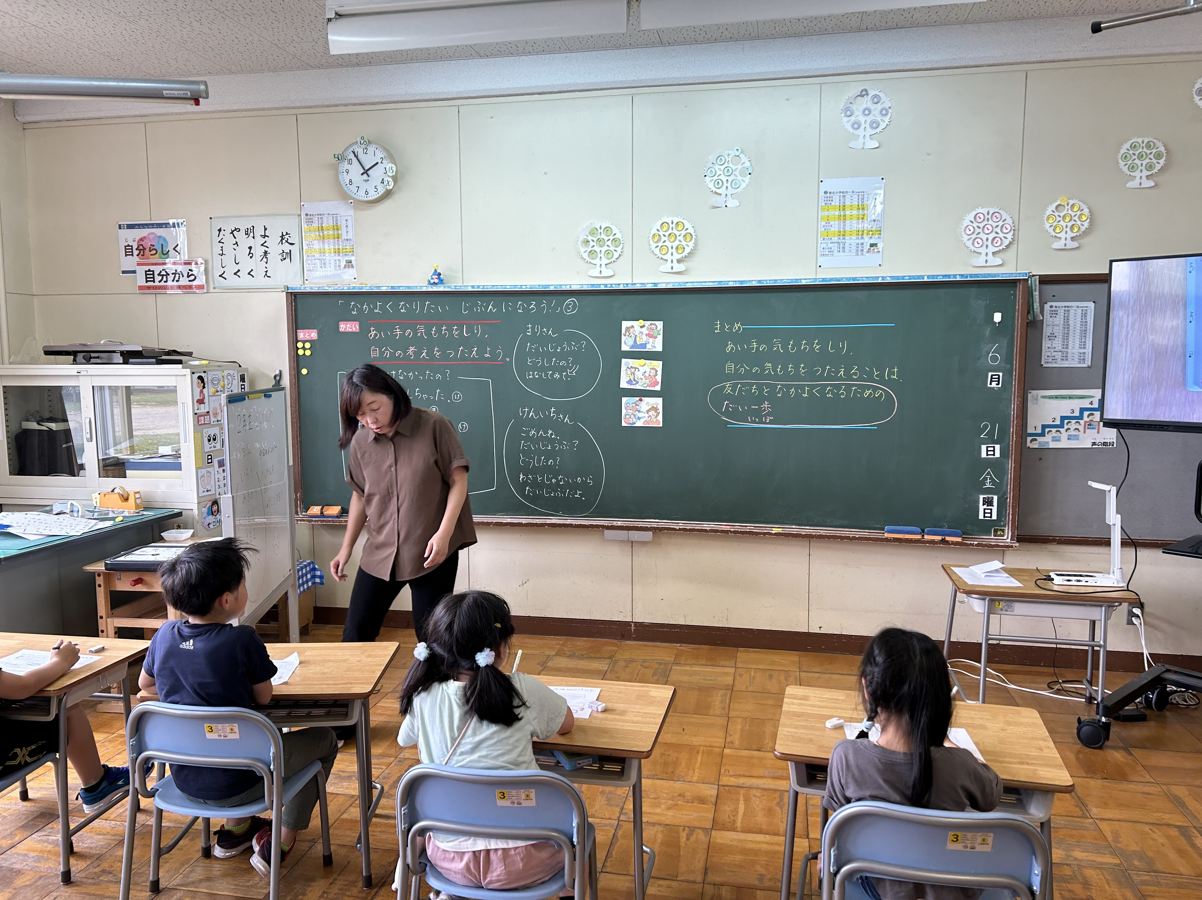 6月21日には、特別支援学級(情緒学級)の研究授業を行いました。「なかよくなりたい じぶんになろう!」の単元で、相手の気持ちを知り、自分の考えを伝えることができることを目標に授業を行いました。
