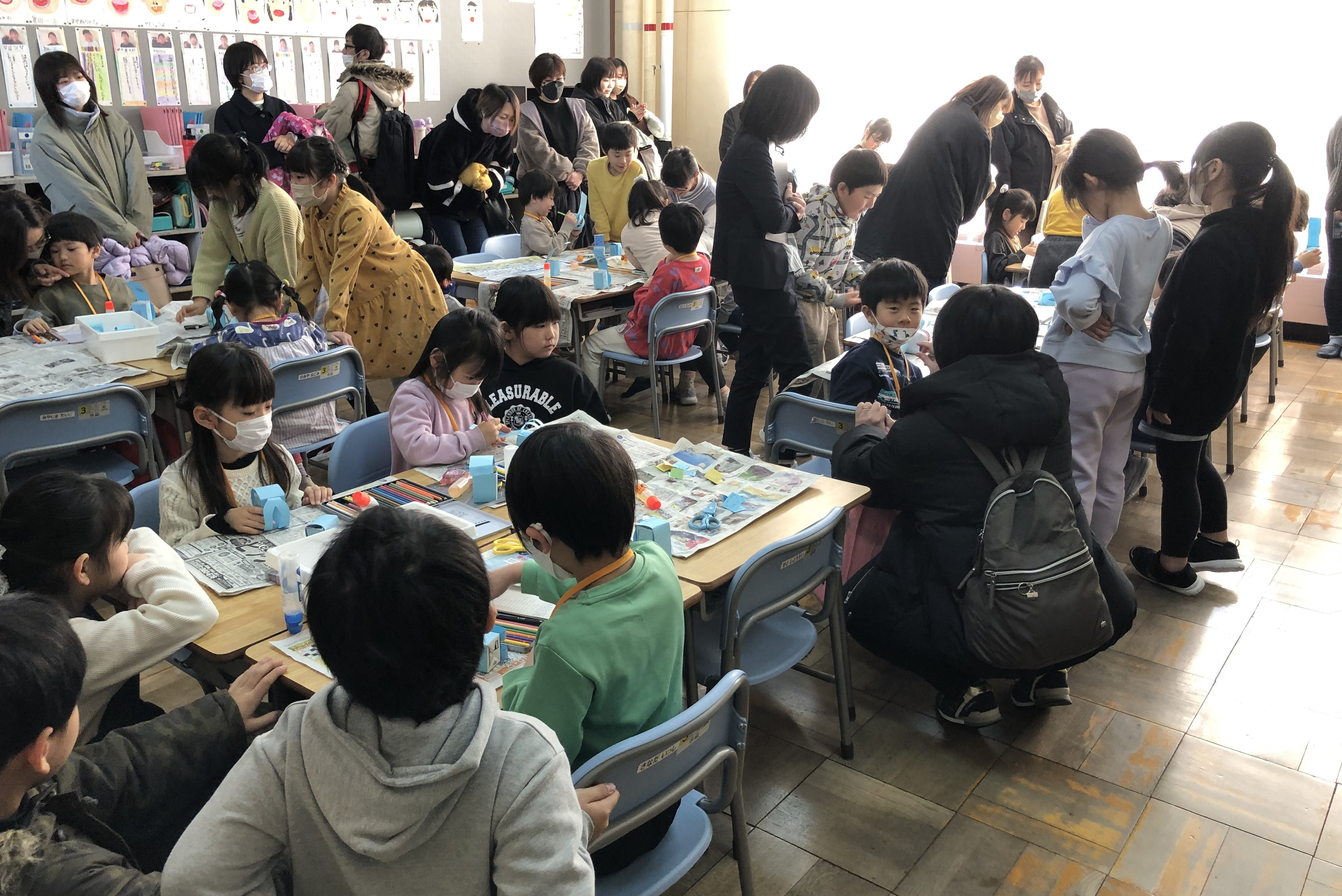 4月に入学する子どもたちが、体験入学にやってきました。1年生と2年生の教室で、一緒に工作しました。はじめは緊張気味でしたが、時間とともに慣れてきて、楽しく話をしながら作っている様子も見ることができました。