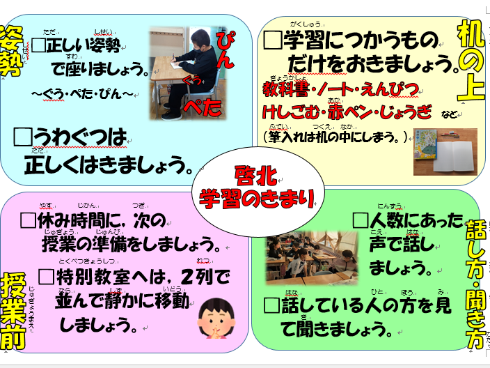 啓北小学校では国語科を切り口に校内研究として指導方法等の改善を図っています。研究の仮説をもとに、全ての教室で「そろえる指導」に努めるとともに、子ども達が安心して学べるように「学びの約束」を決めて、各教室に掲示しています。
